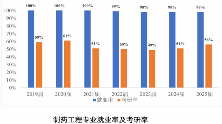 本专业毕业生在制药及相关行业广受欢迎,可从事产品开发、药品生产与管理、技术服务及工程设计等多元化工作。近年来,就业率持续保持在98%以上,众多毕业生就职于省内外知名药企。同时,本专业升学率亦维持在50%左右,大部分学生成功考取国内双一流高校的硕士研究生,为未来的职业发展奠定了坚实的基础。
