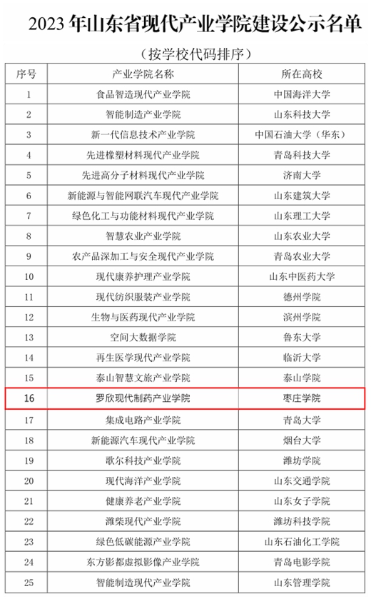 近日,山东省教育厅、山东省工业和信息化厅下发《关于公布2023年山东省现代产业学院建设名单的通知》(鲁教高函〔2023〕42号),确定25个产业学院为2023年支持建设的山东省现代产业学院,我院罗欣现代制药产业学院榜上有名,成为继锂电产业学院之后获批的第二个省级现代产业学院。