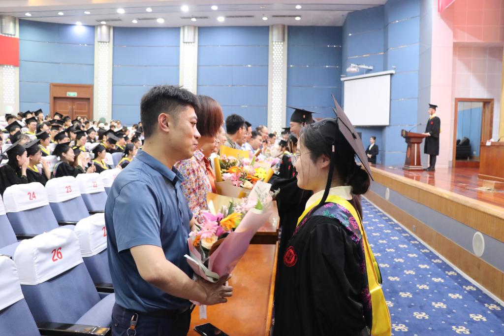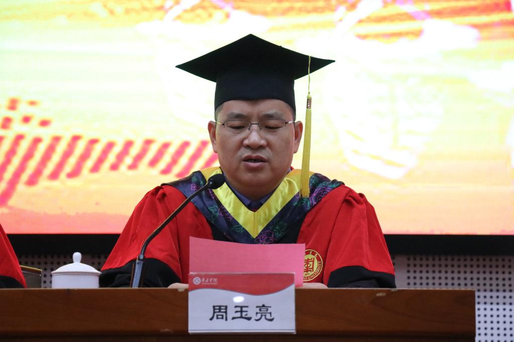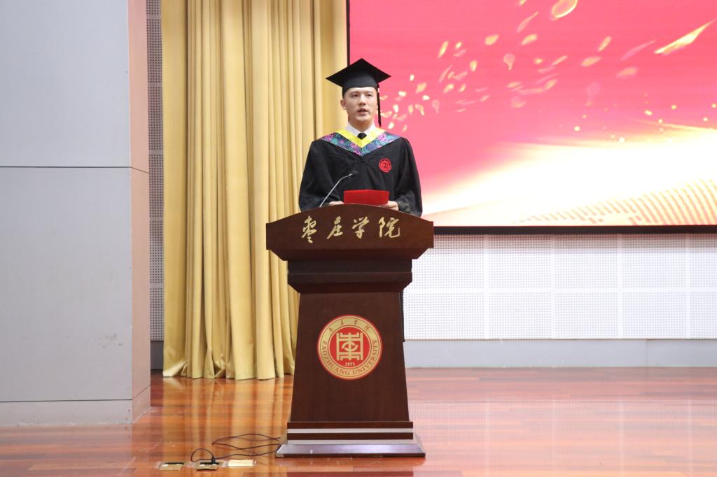 毕业生代表李浩杰回顾了大学四年生活的点点滴滴,代表153名毕业生为母校、恩师和师弟师妹送去了诚挚的祝福,表达了深深的感恩之情。表示要立鸿鹄志,做奋斗者,争做有理想、有本领、有担当的新时代青年,在实现中国梦的生动实践中放飞青春梦想,要在为人民利益的不懈奋斗中书写人生华章。