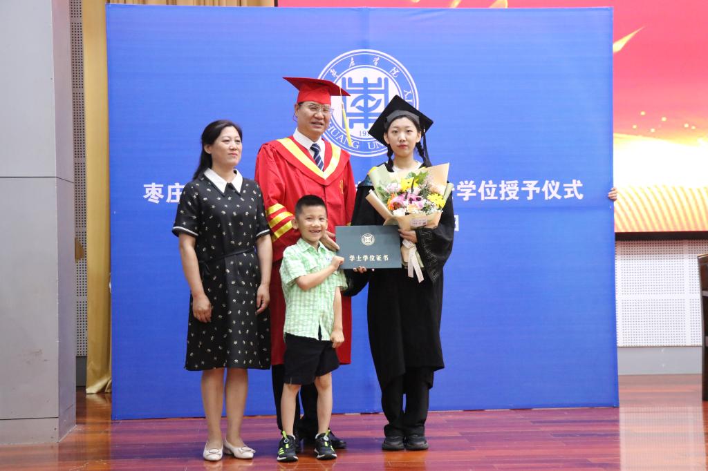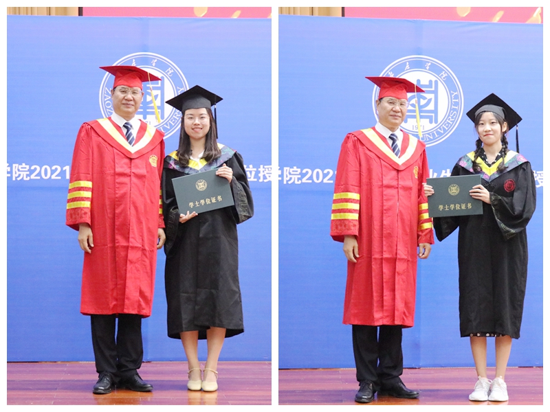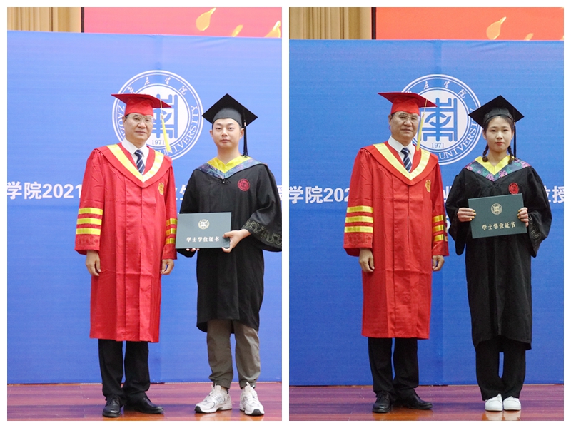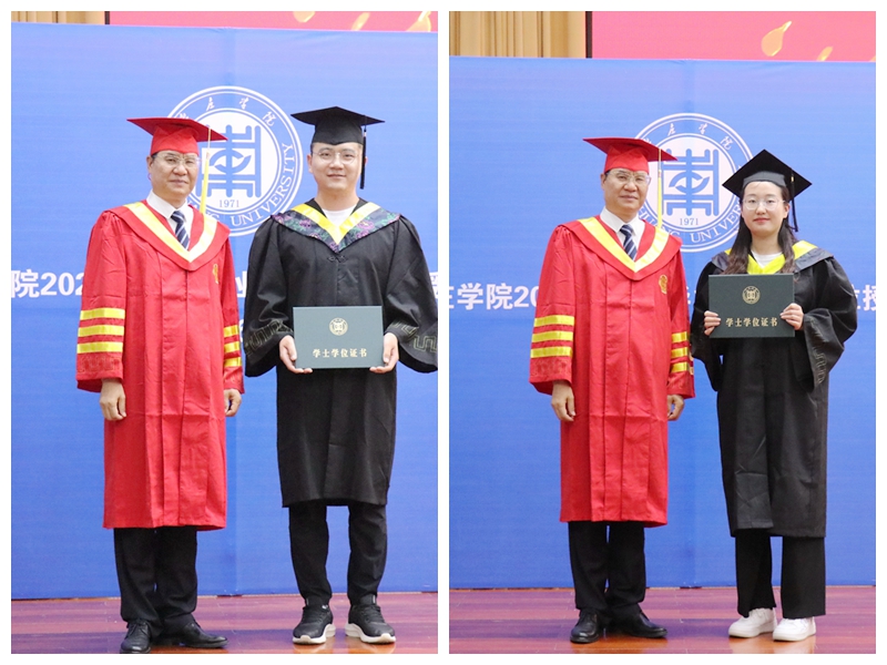 李文喜校长与毕业生亲切握手,为全体本科毕业生一一拨穗正冠并颁发学士学位证书,与毕业生合影留念并送上祝福。