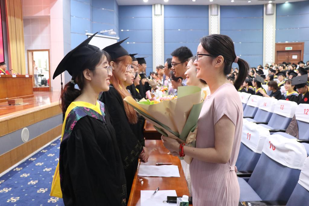 教师代表张沛老师为毕业生送去深深的祝福和殷切的期许,祝福毕业生在今后的日子里一路顺风,一马平川,一路高歌!她表示,完成阶段性学业只是“万里长征走完了第一步,以后的路程更长,工作更伟大,更艰苦”,希望全体毕业生能够坚定理想信念,恪守真善美的准则,求真务实,奋斗不息,不断提升学习力,保持学习的激情,不畏挫折,争创佳绩。