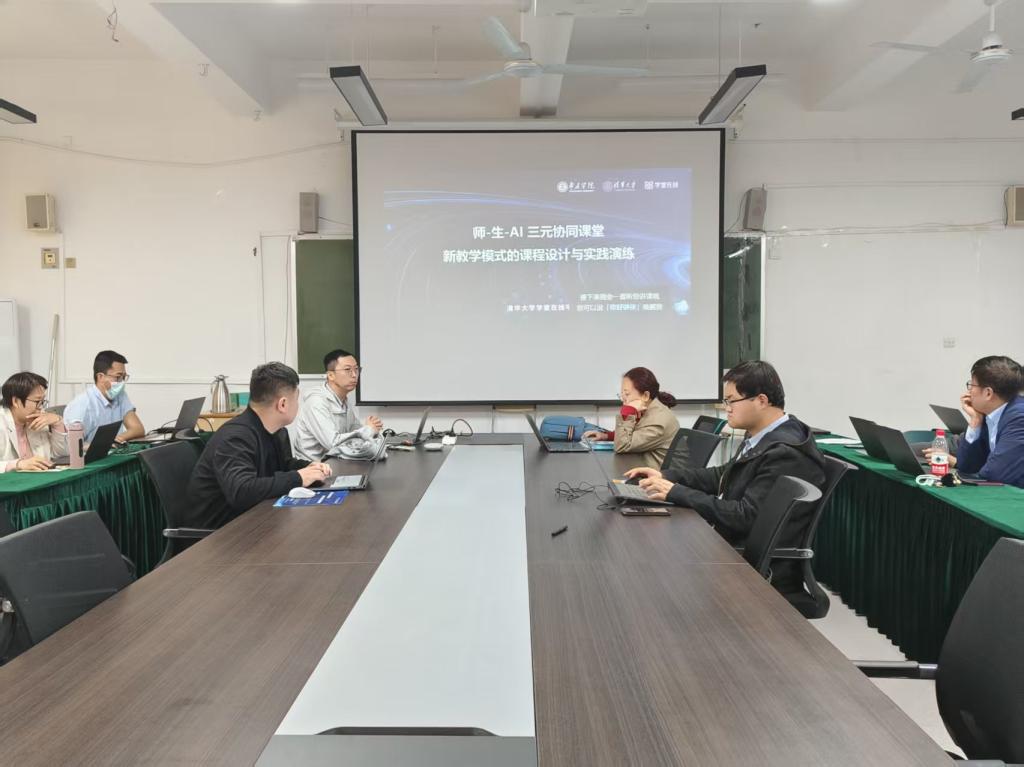 培训围绕教育部“四个未来”内涵、三元协同课堂设计、长江雨课堂AI平台实操应用展开,重点讲解软件安装、身份绑定、智能备课、AI讲伴、课题智能互动、学情分析等功能,并进行现场演练。
