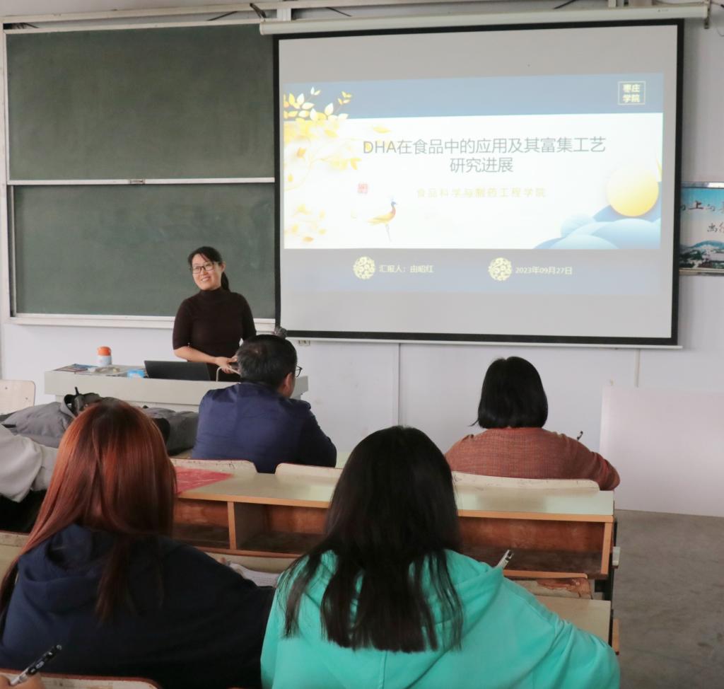 为进一步增进学术交流,拓展学院师生的学术视野。yl23455永利于9月27日在文科楼117教室举办题为“DHA在食品中的应用及其富集工艺研究进展”的学术报告会。本次报告会由由昭红副教授主讲,智慧生物医药科研团队全体教师及2021级、2022级食品科学与工程专业全体学生参加。