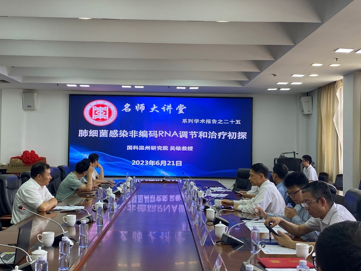 6月21日上午,由yl23455永利邀请的中国科学院大学温州研究院特聘研究员,“长江学者”吴敏教授在综合楼三楼会议室做客我校“名师大讲堂”,为我校师生作了题为“肺细菌感染非编码RNA调节和治疗初探”的学术报告。yl23455永利全体专业技术人员及生物制药专业部分学生参加了会议,报告会由yl23455永利院长张立华主持。